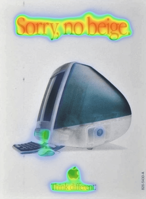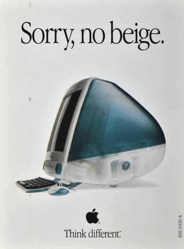 Apple challenges the status quo with this vintage ad, taking a bold stance against the monotonous beige PCs that dominated the era. With the phrase "Sorry, no beige," it instantly captivates viewers by positioning its product as a symbol of innovation and creativity. The vibrant, curvaceous design of the computer stands in stark contrast to the traditional boxy PCs, reinforcing Apple's "Think different." mantra. This ad resonates because it's more than just showcasing a computer; it's an invitation to join a movement of forward-thinkers, daring to be different.